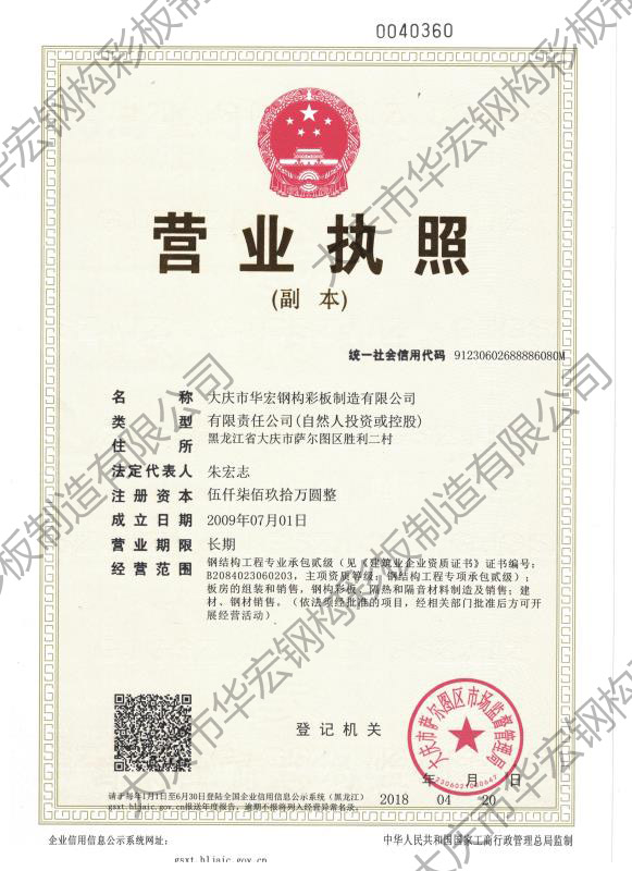 華宏鋼構(gòu)始建于2009年8月9日,總部位于大慶市薩爾圖區(qū)南一路13號(hào),現(xiàn)有大慶市華宏鋼構(gòu)彩板制造有限公司、黑龍江省華宏力安綠建科技有限公司、大慶市華宏鋼構(gòu)彩板制造有限公司長春分公司、黑龍江省海森新材料科技有限公司、大慶市瑞和通螺栓廠五家工業(yè)企業(yè)形成了以彩板復(fù)合板、裝配式鋼結(jié)構(gòu)建筑、保溫材料、配件制造為主的五大生產(chǎn)基地,占地總面積 20余萬平方米,生產(chǎn)車間5萬平方米。中高層管理干部26 人,高級(jí)工程師9人,各類國家注冊執(zhí)業(yè)人員 32 人,車間技工 260人,專業(yè)安裝隊(duì)伍 10 余支,帶動(dòng)就業(yè) 500